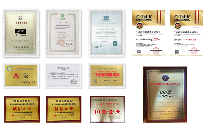 公司歷經(jīng)多年的艱苦創(chuàng)業(yè)和睿智經(jīng)營,已發(fā)展成為中國軟飲料行業(yè)佼佼者。一直以來,仙津銳意進取,憑著良好的市場口碑、優(yōu)秀的產(chǎn)品質(zhì)量、誠信的服務(wù)態(tài)度,得到了政府部門和社會機構(gòu)的認(rèn)可。時任全國政協(xié)副主席葉選平先生親自題名,公司還先后被評為“國家高新技術(shù)企業(yè)”、“連續(xù)19年榮獲廣東省守合同重信用企業(yè)”、“東莞市上市后備企業(yè)”、“東莞市光彩事業(yè)貢獻獎”、“東莞市名譽倍增試點企業(yè)”、“東莞市友善企業(yè)”、“橫瀝鎮(zhèn)納稅貢獻先進單位”等數(shù)十項榮譽。